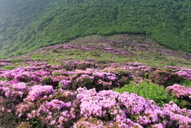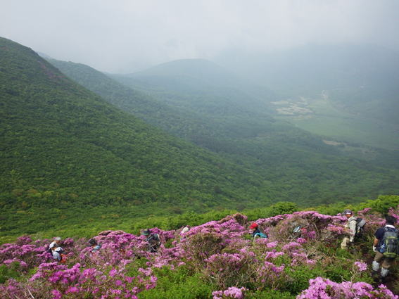 平治岳本峰斜面 ガスの切れ間に見えたミヤマキリシマの群落