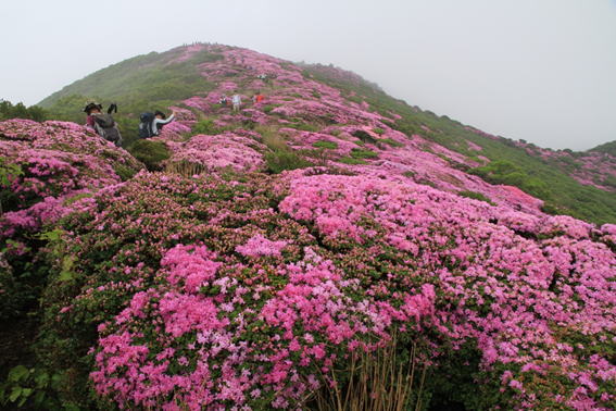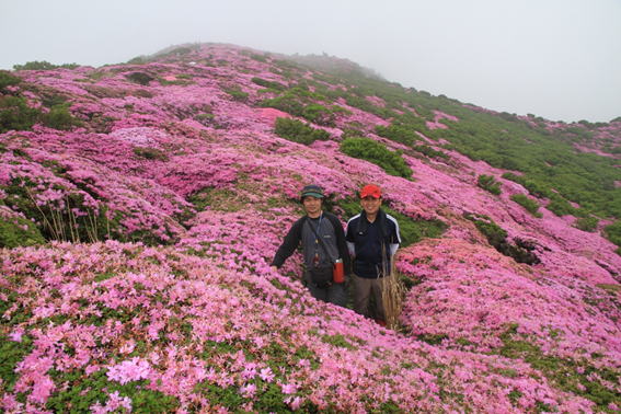 | 平治岳 本峰斜面のミヤマキリシマ 8時35分 霧が晴れてきた! 見えた! 霧は完全に晴れた訳ではないが、この好機を逃さずいろんな角度でシャッターを切った! |