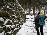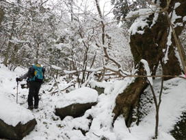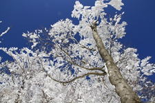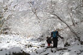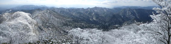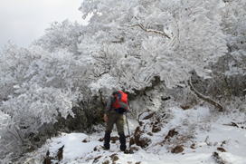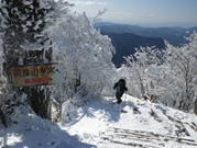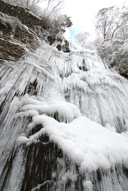 | 知る人ぞ知る「幻の滝」が今年マスコミで報道され一躍ブレイクした。その名は「四王寺滝」と命名されて、今や平日でもたくさんの人々が訪れている。今回はその氷瀑を鑑賞し、南岳から中岳へと足を伸ばした。天気予報通り午後からは晴天となり、スカイブルーに映える樹氷は最高の表情を見せてくれた。 |