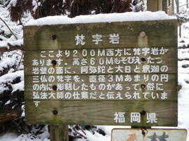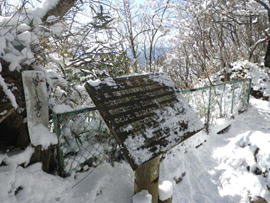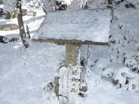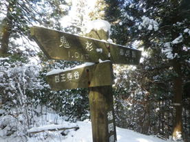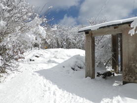 奉幣殿が見える展望所 8時45分 空はどんより曇っている。ここにはひさしのあるベンチが一つ備えつけてあった。 森の中に雪を被った英彦山神宮奉幣殿が見える。 なかなかの風景だ。これから本格的に登山道を進んで森の中へと入って行くが、思ったより登山者は多くない。 お天気は回復傾向なので期待して進んで行く。