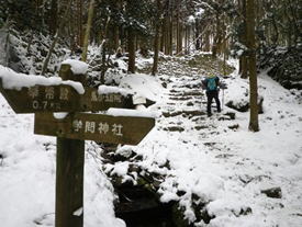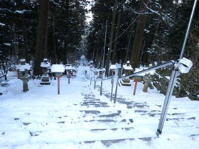 奉幣殿 8時28分 駐車場から宿坊跡の近道を歩き、約20分で奉幣殿に到着した。途中から雪道となるが、雪の下はアイスバーンなのでとてもよく滑る。アイゼンを装着するタイミングを考えながら恐る恐る歩いてとうとうここまで来てしまった。 表参道の長い石段を見下ろすと、雪に覆われ純白の石段と化していた。この石段の出発点には「銅(かね)の鳥居」がある。 |