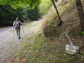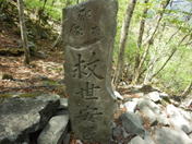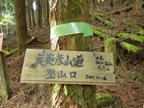 薬師林道 7時49分 ここから薬師林道に入る。林道入り口で裏英彦山道への小さな表示を見つけた。バイクの轍の跡がある。通行禁止のはずだが・・・。 古びた表示 |