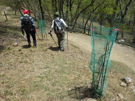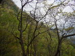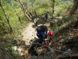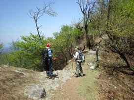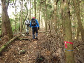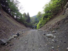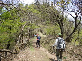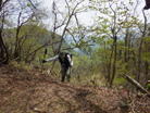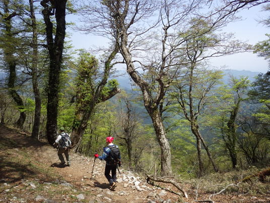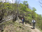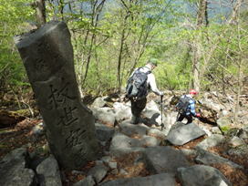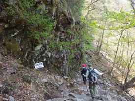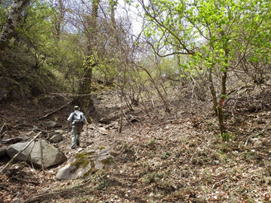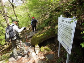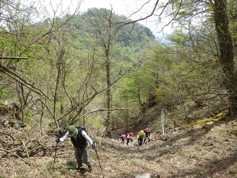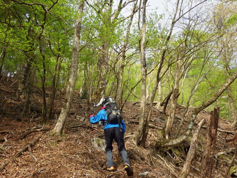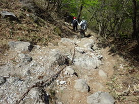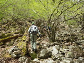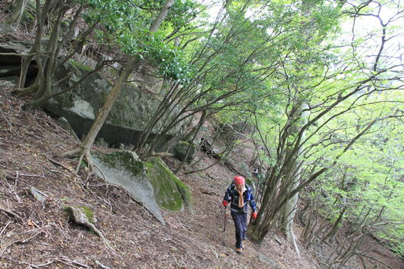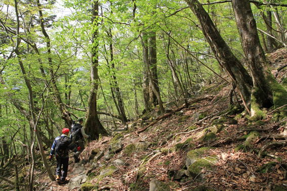 新緑が太陽の光でキラキラと光る。しばらくその素晴らしい光景に感動しながら歩いていると、突然大きな岩がゴロゴロとしたゴーロ帯に行き着いた。先行の二人を見ているとそのゴーロ帯の中を下って行くではないか!確かに赤テープが木に巻いてある。間違いなく登山道なのだが、岩が不規則でとても歩き難かった。転倒しないように足下注意だ!