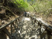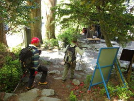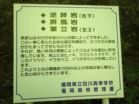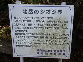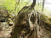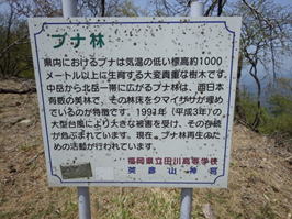 ブナ林 12時10分 県内におけるブナは気温の低い標高約1000m以上に生育する大変貴重な樹木です。中岳から北岳一帯に広がるブナ林は、西日本有数の美林で、その林床をクマイザサが埋めているのが特徴です。1991年(平成3年)の大型台風により大きな被害を受け、その存続が危ぶまれています。現在、ブナ林再生のための活動が行われています。(説明看板より) |
