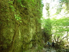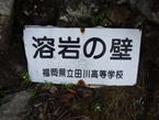 溶岩の壁 12時54分 ロープが張られた、歩き難い岩ゴロゴロの道を下って行くと、左手に大きな溶岩の壁が現れた。今にも崩れそうなのだが・・・。 福岡県立田川高校 |