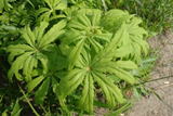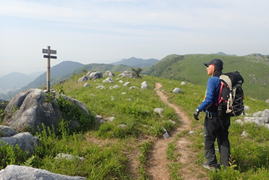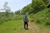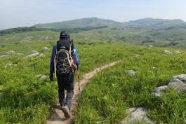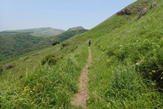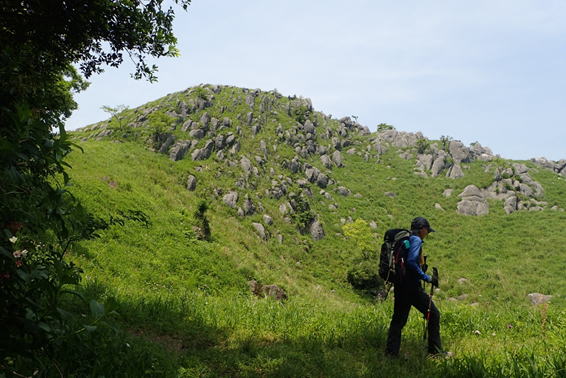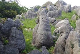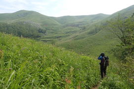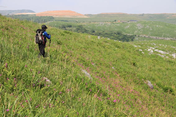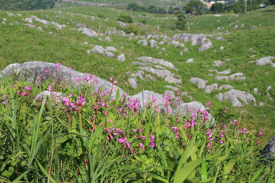 遠くを眺めると、この先にある窪地(ドリーネ)の斜面にシランがたくさん咲いている。 |