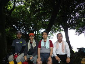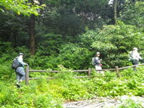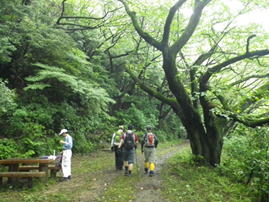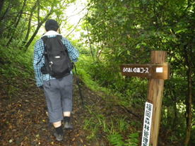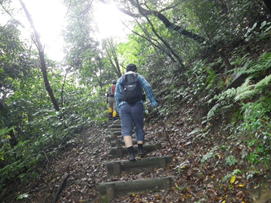 長くて急な階段を上って行く 9時45分 緑濃き森の中、急登を全員寡黙になって上って行く。 お互いを気遣う様子もない。遅れをとってはいけないと自分のことで必死である。 このふれあいの森コースは今日の行程の中で一番の踏ん張りルートだと思う。 汗は拭いても拭いても噴き出してくる。 「ハァーハァー」と息遣いが荒い。 気がついたら4人がバラバラになって上っていた。 |