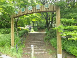 冒険のもりのゲートをくぐる 12時09分 これより山頂まで長い階段を進んで行く。 変則階段 |
