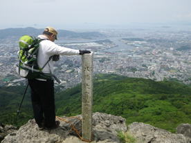 霞む北九州市内を一望する。正面には若松の三座が見える。 M君の奥さんはどこ?(笑)
