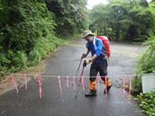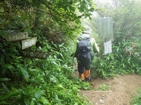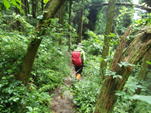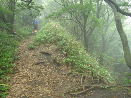 植林帯を下って行く 11時08分 あとはどんどん下るだけ。幸いなことに下るにつれて雨も止んできた。植林帯を抜けるとまた自然林の中へ突入! 足下注意! |