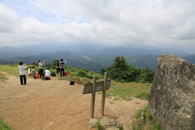 雷山山頂風景 10時39分 私たちとほぼ同時に別のルートから引率の先生と共に女子大生らしき9人グループが上ってきた。彼女たちは元気ハツラツ!山頂標識の後ろにある大岩に登ってポーズを決めて記念撮影をしていた。10分程休憩すると、円陣を組み、掛け声上げて私たちの歩いてきた井原山方面へ行ってしまった。 |