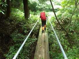 小さな木の橋を渡る 11時33分 橋を渡るとそこは布牧林道からの登山口だった。 この木の橋は雨に濡れると滑り易い。 |