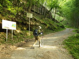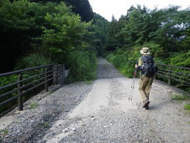 2、これから林道歩き 7時03分 コンクリートで固められた林道をテクテク歩いて行く。 |