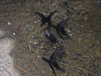 8、水無鍾乳洞第1洞 12時04分 4〜5人がこの穴の前に立っていた。近づくと、この穴からとても冷たい風が吹いてくる。 最初は冷たくて気持ち良かったが、3分もしないうちに寒くなった。あわててこの場所を離れると一気に、む−っと暑くなって、メガネが雲ってしまった。これぞ天然クーラー。 是非自宅に欲しいものだ。 |