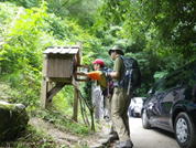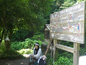 4、水無登山口 8時05分 駐車場の奥左手から登山道が伸びている。 |