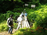 丸太の橋が滑る 8時12分 丸太が少し朽ちている、しかも濡れていて、ツルツルと滑る。皆さん慎重に渡っている。 |