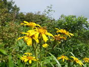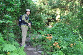 丸太の橋を渡ると・・・ 8時10分 すぐに足下にオレンジ色の花が出迎えてくれる。道沿いにずっと続いて咲いている。 |