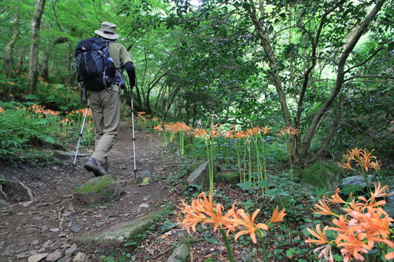 登山道の両サイドにオオキツネノカミソリがずっと咲いている