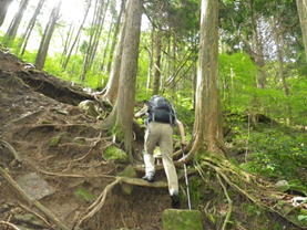 急登を上り詰める 9時35分 約20分、急登との格闘が終わると、すぐに尾根の縦走路と合流する。 |
