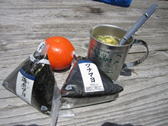 犬ヶ岳山頂広場 10時35分 避難小屋兼展望台に上ってはみたがあまり風景は望めない。陣笠の登山者と情報交換。 |