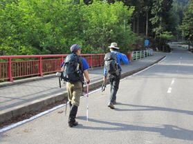 岩岳川に架かる赤い橋を渡る 7時25分 犬ヶ岳の標識を見ながら橋を渡る。 |