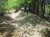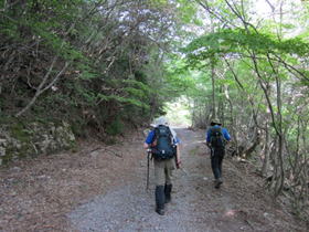 林道を進む 8時46分 新緑を楽しみながら林道を歩いた。 |