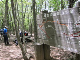 我々はこのまま尾根を歩き「一の岳」へと向かうが、この大竿峠からは犬ヶ岳登山口に続く「恐れ渕コース」がある。このコースを利用する人も多い。 結局このご夫婦と一の岳から求菩提山下山までご一緒することになった。このご夫婦はとても足が速く、私はついていけなかった。 |