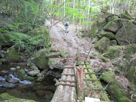 古い木の橋 8時01分 歩き難いので慎重に渡る。おっとっと・・・。 |