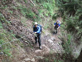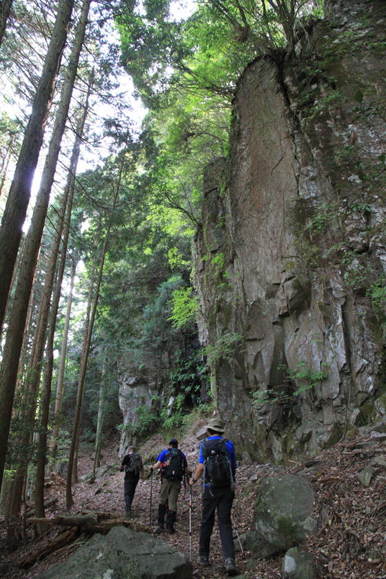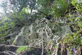 5、笈吊岩(おいつりいわ)挑戦 9時17分 私たちの前に7人のグループが歩いていたので、ゆっくりついて行った。ところが、このグループは笈吊岩を通り過ぎて、う回路へと進んだ。という訳で、私たち3人だけが笈吊岩に挑戦することになった。太い鎖を両手に持って岩をよじ登ったが、2メートルほど登った時に後悔した。思ったより足場が悪く、鎖に頼らなければ登れない。マジで必死だった。怖かった。 |