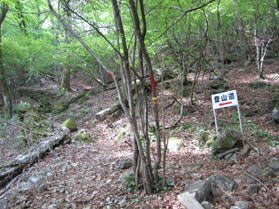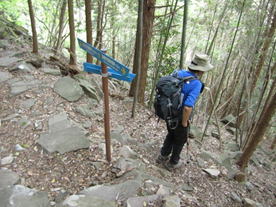 林道からまた急登 8時47分 笈吊峠まであと460m。まだまだ・・・。 |