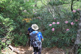 | この笈吊岩(おいつりいわ)の由来は、その昔、修験者たちがあまりの険しさに背負っている「笈」(四角い箱のようなもの)を背から下し、ひもで吊るして引き上げたと言われているところから、その名前が付いたと言われている。 今回実際に上って見たが、鎖があるとはいえ決して油断は許されない。上り終えるまで緊張の連続だった。上り終えて、「滑落事故多発」の看板を見た時、本当に「ゾッ」とした。(実は上る前にもこの看板があったのだが、見落としていた) ※この岩登りは挑戦しないことをお勧めします。 ちゃんと「う回路」があるのでそちらを利用する方が間違いなく賢明です。 という訳で、少々安堵し尾根歩きに入った。そこにはシャクナゲの花々が待っていた。 9時37分 シャクナゲを観賞し、写真を撮りながらゆっくり尾根を歩くことができ、とても気分がよかった。 |