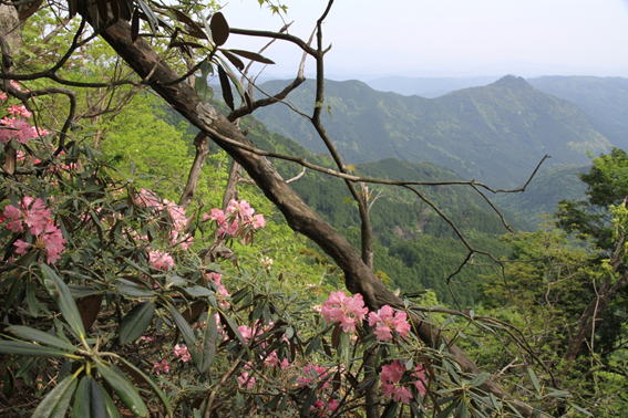 笈吊岩の上から求菩提山(右側のピーク)を望む。 ツクシシャクナゲが綺麗だった。