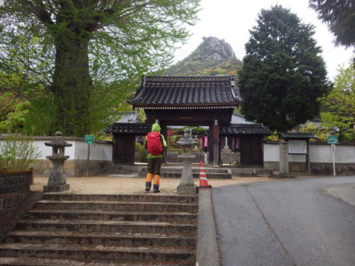 2、天徳寺の山門前 8時41分 山門の上に右田ヶ岳への最初のピーク「石船山」が聳える