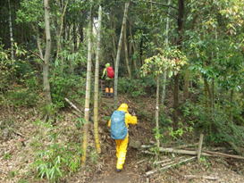 小ピークにて 10時21分 一息つける場所に出た。下界を見下ろし水分補給。必死に上るこの急登、レインウェアを着ているので蒸し暑くて汗ビッショリだ! 新緑が萌える |
