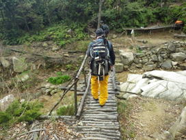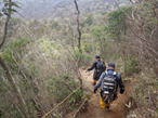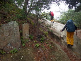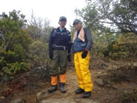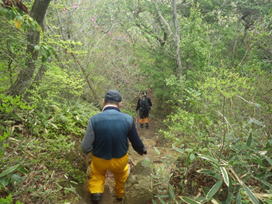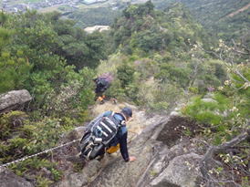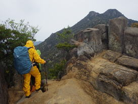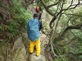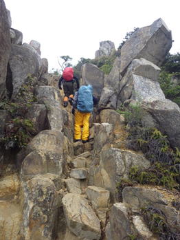雨が止んだ 10時45分 断続的に降っていた雨が登頂前にとうとう止んでくれた!ラッキー!レインウェアの上着を脱ぎ、ホッとして足取りが軽くなる。 ![]() 右側が切れ落ちているロープ場も、少々緊張したが無事にクリアした。10時52分 |