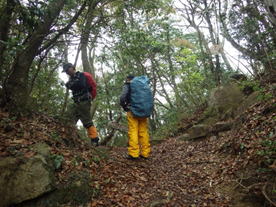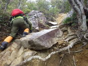 右田ヶ岳を下山 12時14分 山頂ポストの間から下山開始。道ははっきりしているので心配はなさそうだ。ザラザラとした登山道を用心しながら下って行く。 ロープ場 |