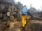 頭上の奇岩に観音様が刻まれている 9時08分 見上げて撮影をするYさん |