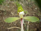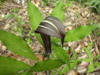 後姿で「ハイ、ポーズ!」 11時34分 右田ヶ岳山頂の岩場に立って三人でポーズ。 画になりませんね(笑)。 山頂大岩の下でひっそりと咲く小さな花を見つけた。 シュンラン |