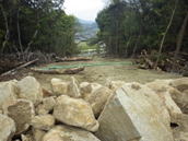 土砂崩れの大きな傷跡 13時49分 民家が近い。土砂崩れの際、地元の方たちは生きた心地がしなかったのでは? 工事中 |