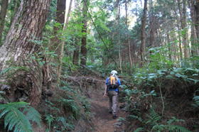 森の中に入って行く 6時38分 登山口から森に足を踏み入れると、登山道は大きな溝のようにえぐられていた。 |