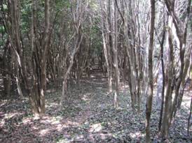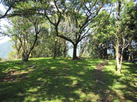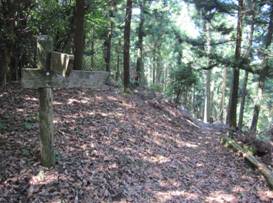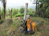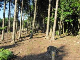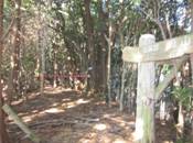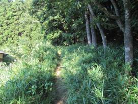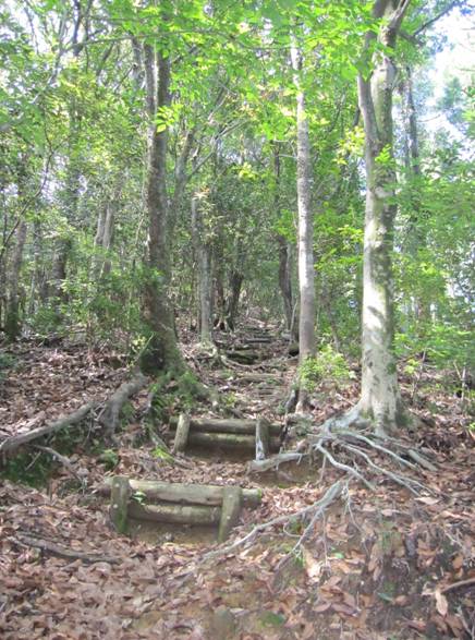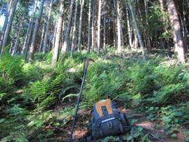 斜面で休憩 7時21分 まだ早朝というのに気温が高い。しかも登山口からずっと急坂が続く。汗が滴り落ちる。 ここでリュックを下して5分休憩。斜面を見上げると杉林がある。 登り始めの急坂はいつも堪える。まだまだ先は長いのに・・・。ちょっと気持ちが萎えそうになる。 |