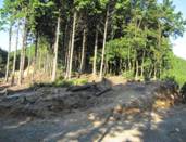 少し歩くと、再度、林道に出た 8時03分 どうやら災害復旧の工事用の道のようだ。 ここも道路を横切り杉林の中へと進む。