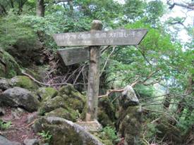 先程の分岐に戻る 11時52分 古処山山頂まであと300m。 しかし、ここから岩場連続の最後の登りとなる。 すでに11キロほど歩いているので足が言うことをきかない。情けない。 よく考えると、ここまでで出会った登山客は単独行が一人と、2グループだけだった。 やはり今日は暑いので登山を敬遠している方が多いいのだと思った。 |