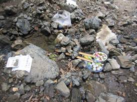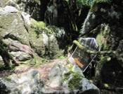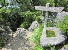 6、水舟 12時35分 水場に到着。チョロチョロと申し訳なさそうに水が出ていた。ここから先の下り登山道は水害のせいなのか、土砂崩れあとの荒れた道となる。 10年前に登ったことはあまり覚えていないが、こんな状態ではなかったはずだ。 |
