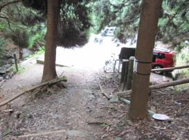 7、古処山中腹の駐車場に到着 13時08分 ここで思わぬハプニング!なんと、いつも使用しているデジカメが突然壊れてしまった。撮影が出来ない。冷静さを失い、あたふたとしながら駐車場をまっすぐ進むと舗装道路に出た。そして、そのまま下って行った。これが間違いだったのだろう。どうやら登山道をはずれてしまったようだ。「おかしいなあ」と思いつつ、引き返すことなく車道を下った。 |