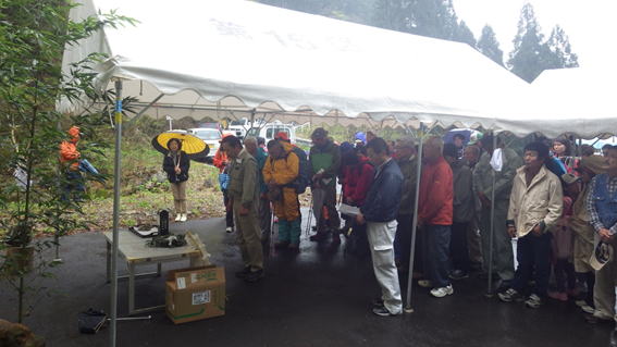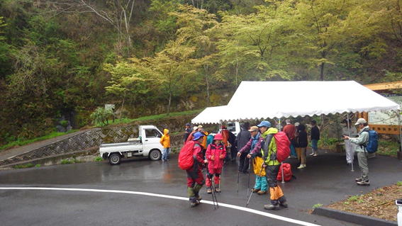 仮設のテントでは山開き参加者の受付を行っていた。受付で300円の支払いを済ませ、住所等を記入すると、記念のタオルを頂いた。下山後に「滝の脇農村集落センター」において、だご汁の昼食を用意しているとのことだった。これは下山後が楽しみだ! |