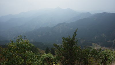 カラ迫岳山頂からの風景は霞んで残念。遠方に釈迦岳、御前岳の稜線が見える。