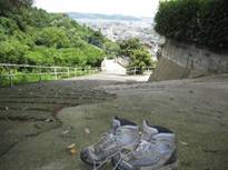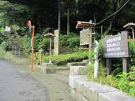 民家の横を上り、いよいよ登山道 10時35分 舗装道路も終わり、山の方へ入っていく。 しかし、やぶ蚊がたくさんいて落ち着いて休憩ができず、すぐに戸の上山を目指してスタートした。 最初はコンクリートの長い階段だった。 |