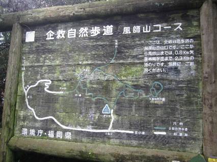 2、風師山登山口 7時45分 ここから企救自然歩道。 風師山頂 3.2キロ 戸の上山頂 9.4キロ 足立山頂 14.8キロ と表示してある。 標識横の階段を上って行くが、すぐに車道に出た。以後この車道を道なりに進んでいった。 |