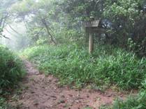 風頭岩峰への分岐 8時32分 9合目からの本格的な登山道に入ったとたんに何故か辺りが明るくなった。視界が広がっていく。霧が晴れていくのがよくわかった。ラッキー。半ばあきらめていた眺望に希望が持てる。足どりも軽くなり岩峰を目指す。 |